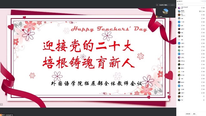 在第38个教师节来临之际,乐鱼leyu(中国)大学英语拓展部全体教师于9月8日下午2点,相聚云端,以 “迎接党的二十大,培根铸魂育新人”为主题,进行了立德树人研讨活动。乐鱼leyu(中国)副院长谢竞贤老师出席了本次研讨,支部书记邢嘉锋老师主持了本次研讨会。