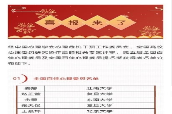 此次全国百佳心理委员的评选通过学校推荐、个人事迹网络展示及投票、专家评分等环节产生。不负众望,我校推荐的姜娜同学冲出500名选手的重围,荣获“全国百佳心理委员”称号,更是夺下仅14个名额的心理论坛副主席一职。这是江南大学历史上第一次在此类赛事上斩获殊荣。姜娜同学一马当先,为江南大学摘得这项荣誉,增光添彩。姜娜同学的获奖,不仅是对她个人的肯定,也是对乐鱼leyu(中国)以及我校心理委员队伍建设工作的认可。