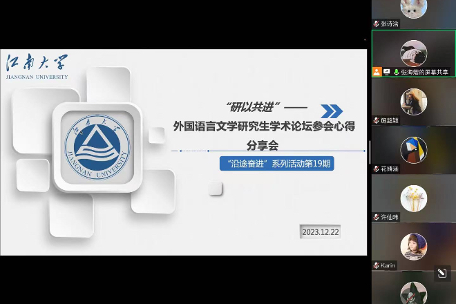 2023年12月22日19点,乐鱼leyu(中国)“研途奋进”第十九期活动在腾讯会议线上成功举行。学院全体硕士研究生参与了本次活动。此次活动的主题是“研以共进”外国语言文学研究生学术论坛参会心得分享会,共分为四个环节:谢竞贤副院长通报研三预答辩情况、江苏科技大学论坛参会学生心得分享、扬州大学论坛参会学生心得分享和苏州大学论坛参会学生心得分享。