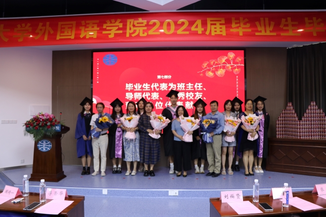 随后,毕业生代表为班主任老师、研究生导师代表、优秀校友、董事单位代表献花。学院副院长谢竞贤为本届校友联络员颁发聘书,并赠送毕业纪念品。