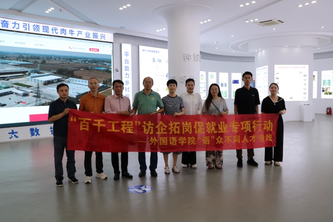 随后,一行人来到安徽徽牛云科技有限公司,公司以“平台助力乡村振兴,联农带户共同致富”为使命,通过“公司+牧场/合作社”的模式,带动一二三产业联动,形成高科技、高效能、高质量的新质生产力,引领肉牛产业绿色健康可持续发展。实现了传统农业,养殖业与现代科技的完美融合。在参观过程中,双方针对大数据技术进行了探讨,并就如何将其与外语学校结合展开交流。