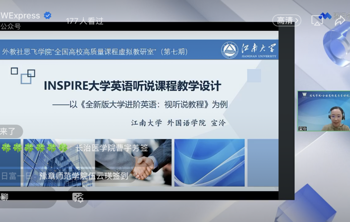 在晚上19:30,宣泠代表大学英语课程团队通过在线平台,为全国大学英语教师举办了外教社思飞学院教学示范课直播讲座。讲座的主题为“INSPIRE大学英语听说课程教学设计”,展示了我校大学英语教学理念和教学模式的创新,助力提升高校外语教师的教学设计能力,推广了我校大学英语教学改革的成果。
