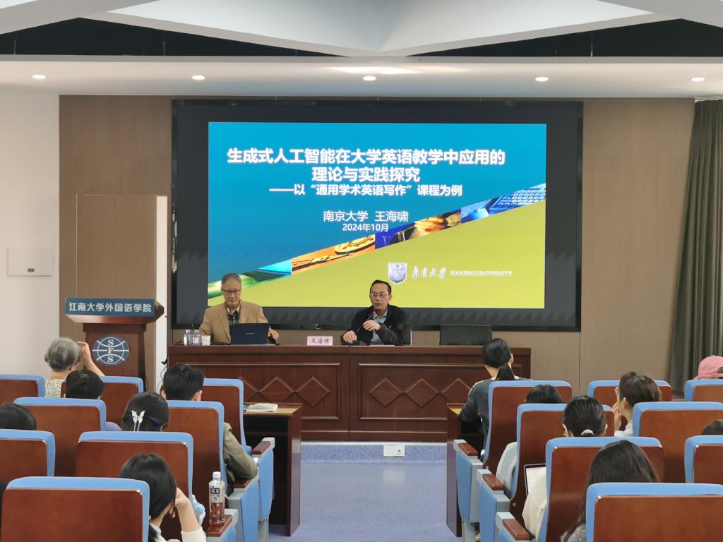 2024年10月30日下午,南京大学博士生导师、教育部高等学校大学外语教学指导委员会委员、全国大学英语四六级考试委员会委员、江苏省高等学校外国语教学研究会会长王海啸教授应邀莅临乐鱼leyu(中国),为我院师生作题为“生成式人工智能在大学英语教学中应用的理论与实践探究”的讲座。讲座由乐鱼官方端网站登录入口方文开教授主持,乐鱼leyu(中国)师生参加了讲座。