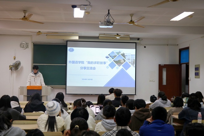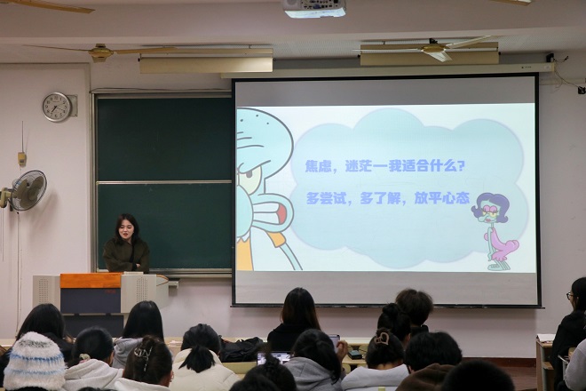 之后姜娜同学分享了她的求职经验与工作经历。她以同龄人的视角,用幽默风趣、简洁明了的语言讲述了自己的成长故事。从求职到入职,她分享了在职业道路上所经历的挑战与收获,她真诚的分享深深感染了现场的同学们。