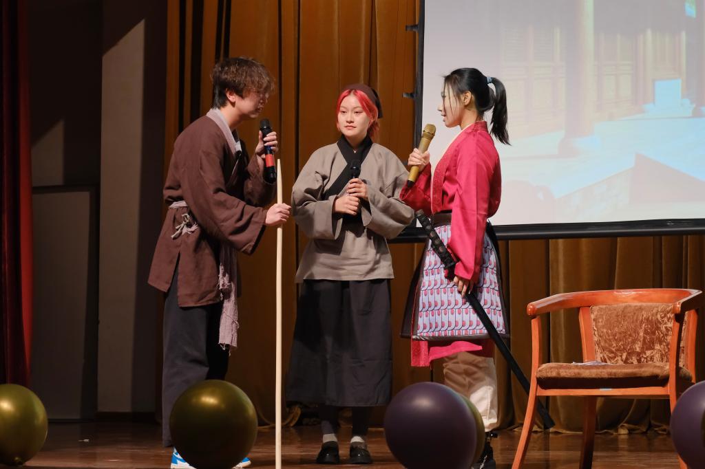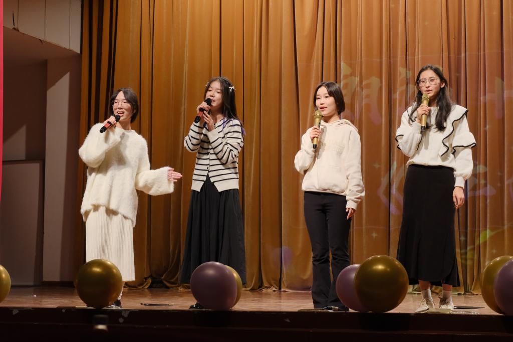第二部分“冉冉向新,执光开路”:诗朗诵《江南》采用朗诵与演唱两种方式,用词句与情感绘出江南烟雨;声乐部带来的《月弯弯》,时而浅吟低唱,时而婉转情深,忽引吭袅袅,又仿佛有着浓浓愁绪,感染了全场观众;语言部的配音节目《What Goes Around Comes Around》与英语社节目前后呼应,向观众们展示了英语的魅力;八英里社团的rap《2024cypher-complex》将全场气氛再次推上了高潮;日语歌《扉をあけて》则与童年共鸣,赢得了观众们的掌声。