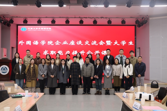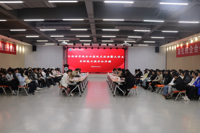 为深化校企合作,加强就业育人,同时激发学生对未来职业道路的积极探索与规划意识,提升就业能力,在临近学校举行春季大型招聘会之前,乐鱼leyu(中国)于3月15日上午,在北活F105举行企业座谈交流会暨大学生求职能力提升公开课,活动邀请中报国际、国泰国华、新东方、海亮教育等10家优质企业参会交流。无锡市人才服务中心王晓蕾,乐鱼leyu(中国)党委书记李荣华,江南大学学工处副处长孔丽丹,党委副书记、副院长季王飞,英语系曹丹,辅导员苗文建,学院2023届毕业生张龙飞以及学院大三、大四200余名学生参加本次活动。活动由辅导员朱家烨主持。