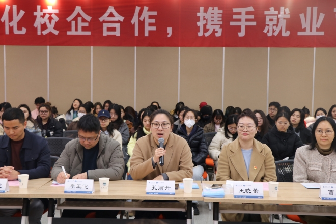 在公开课结束后,现场召开了校企合作洽谈会,李荣华代表学院对各位企业的到来表示热烈欢迎。她从学科建设、教师队伍、人才培养等方面介绍了学院基本情况。期待校企双向发力,围绕国家战略、企业需求、学院特色等方面,共同探索优质人才成长新路径。