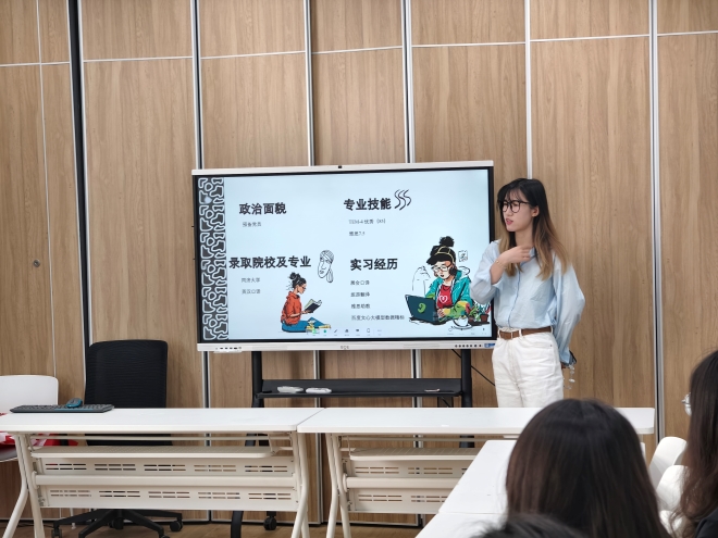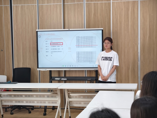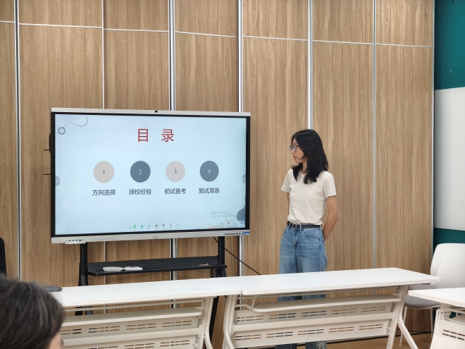 首先,考上北京师范大学的刘舒宁从“方向选择”、“择校经验”、“初试备考”以及“复试准备”四个方面进行分享。在院校选择方面,她建议同学们避免扎堆盲目跟风,要结合专业匹配、自身实力、未来发展等因素综合考量,她鼓励同学们积极参专业类竞赛,从竞赛中学习成长;接着,考上山东大学的辛佳琪重点分享了考研过程中的复习计划与心态调节。她说:考研是一场持久战,一定要制定适合的自己的复习计划,然后按照计稳步进行。她提到备考时需要专注自身学习,避免网络虚假信息引发情绪波动,越到最后,稳定的心态越重要,劳逸结合可以提高学习效率。最后,她推荐了复习资料和工具,为同学们考入理想的学校提供指引;最后,考上同济大学的张怡琳进行分享,她结合自身经历,围绕院校专业选择、复习计划制定、复试能力提升等问题展开细致讲解。她提出考研备考全过程都应按个人节奏制定计划,避免盲目攀比,合理分配时间,兼顾学习与放松,坚定目标。