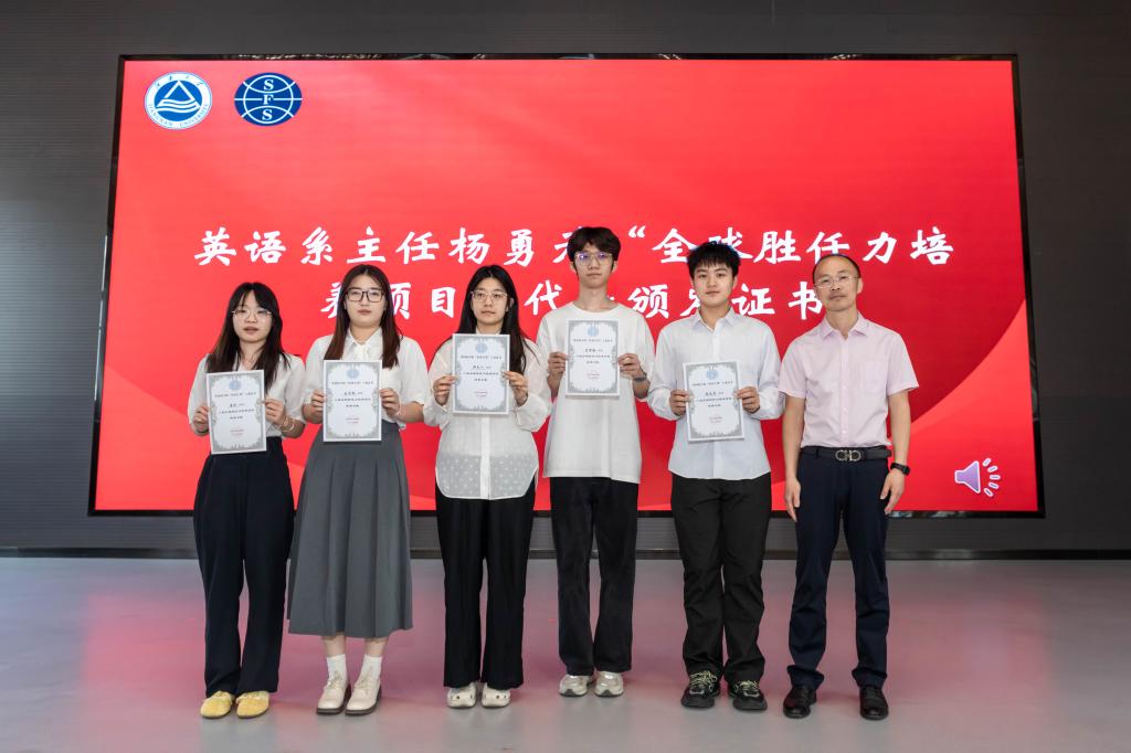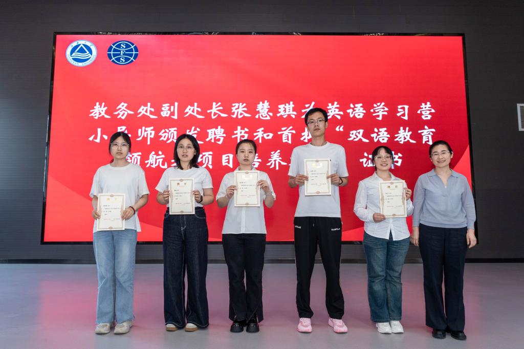 在证书颁发环节,张慧琪为英语学习营小导师及“双语教育领航者”培养对象颁发聘书与证书,吴垚、杨勇分别为“语言菁英培养”“全球胜任力培养”两个项目代表授证。