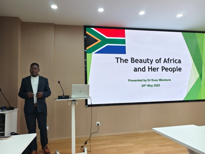 5月28日晚,南非林波波大学农业与环境科学学院高级研究员埃绍·马修斯·姆博卡内博士(Dr. Esho Mathews Mbokane)来到乐鱼leyu(中国),以“Dialogue with World’s Diverse Cultures—Exploring South Africa”为主题开展学术讲座。乐鱼leyu(中国)副院长顾琦一参加讲座,讲座由学院曹丹老师主持,外院师生五十余人参与了本次讲座。