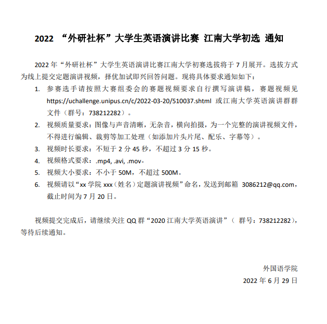 2022“外研社杯”大学生英语演讲比赛江南大学初选通知