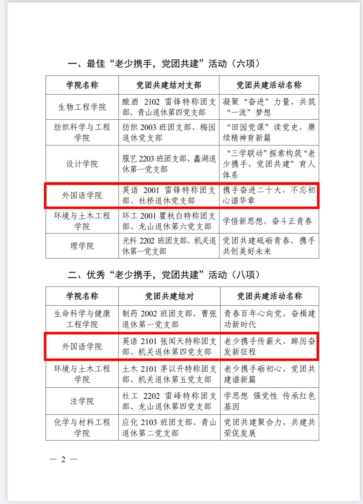 近日,学校党委公布了《乐鱼官方端网站登录入口表彰 2022—2023 年度“最佳‘老少携手,党团共建’活动”的决定》,经专家组评审、校关工委主任会议研究,并报学校党委同意,乐鱼leyu(中国)报送的两项活动均获表彰。社桥退休党支部与英语2001团支部组织申报的活动荣获“最佳党团共建活动”(全校共六项),机关退休第四党支部与英语2101团支部组织申报的活动荣获“优秀党团共建活动”(全校共八项)。