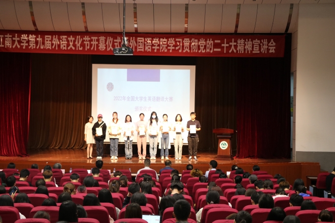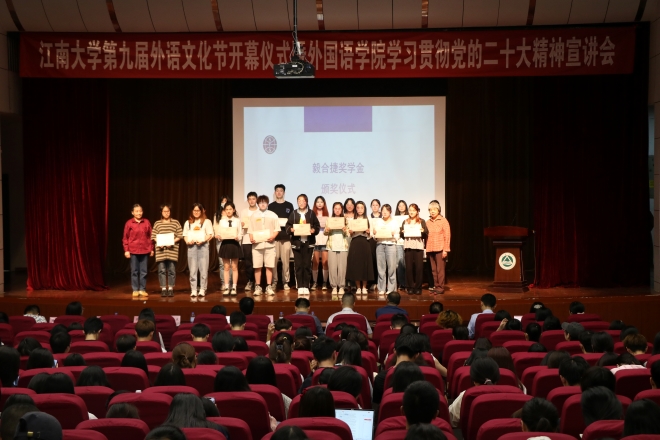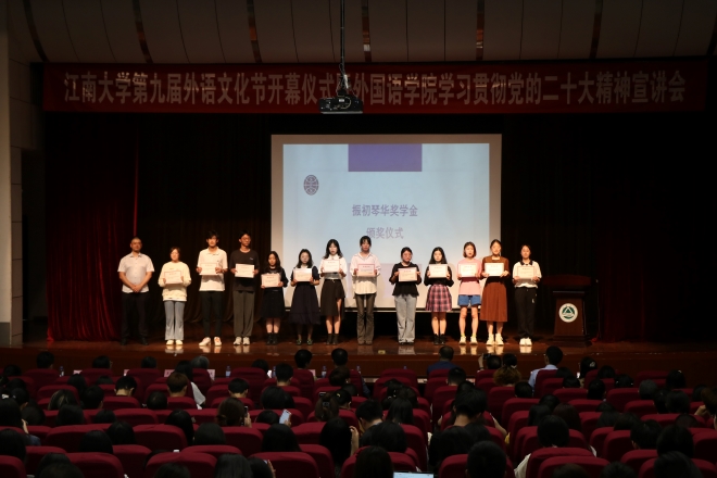 4月19日下午,江南大学第九届外语文化节开幕式暨乐鱼leyu(中国)学习贯彻党的二十大精神宣讲会在南区大学生活动中心如期举行。乐鱼leyu(中国)党委书记李荣华、校党委学生工作部副部长俞立峰、校团委副书记杨飏、学院党委副书记刘伯贤、“振初琴华奖学金”捐赠代表陈志钢、学院英语系主任孙志祥、日语系主任张鹏、学院关工委常务副主任鲍国庆、关工委委员吴艳敏、学院分团委书记陆芳及辅导员、班主任老师出席本次活动,相关学院学生代表以及我院500余名学生参会。