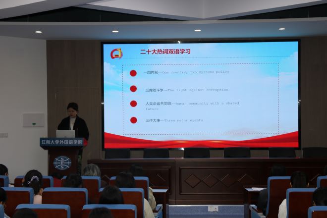 首先,英语2101班团支书柏晶同学通过解读二十大报告向大家讲述了时代赋予青年人怎样的时代使命,以及作为新时代的青年应如何推进文化自信自强,铸就社会主义文化新辉煌。她指出,我们作为乐鱼leyu(中国)的学生,可以通过“用英文讲党史、分享抗疫故事、翻译中国著作”等方法传播中国声音,传承外语人的使命。