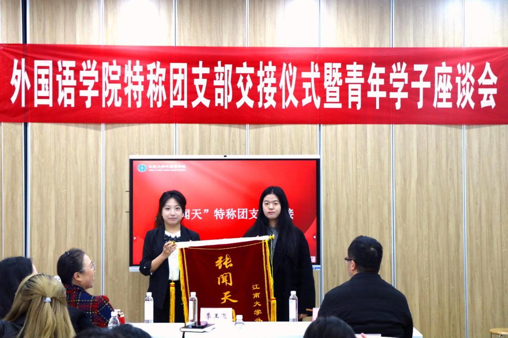 宋苏凤和苗文建为本次优秀团支部颁奖。新一届“张闻天特称团支部”代表朱彤从柏晶手中接过象征张闻天精神的锦旗,表示将学习张闻天的坚定信念与宽广胸怀,实事求是、脚踏实地、勇于担当、砥砺前行,为祖国的建设添砖加瓦。